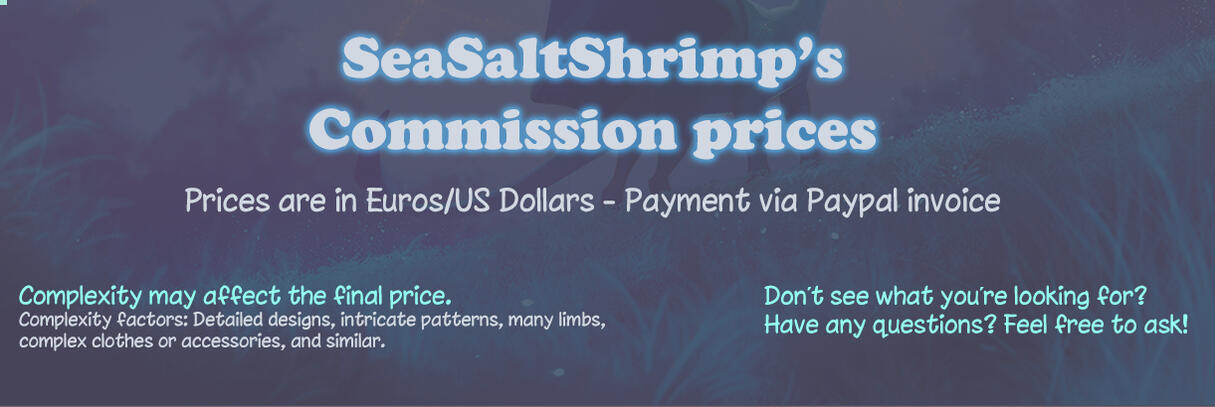 Commissioning me means you agree with my terms below, which may change at any time. Please read them carefully, as I can cancel your commission if I feel my terms are being clearly ignored.